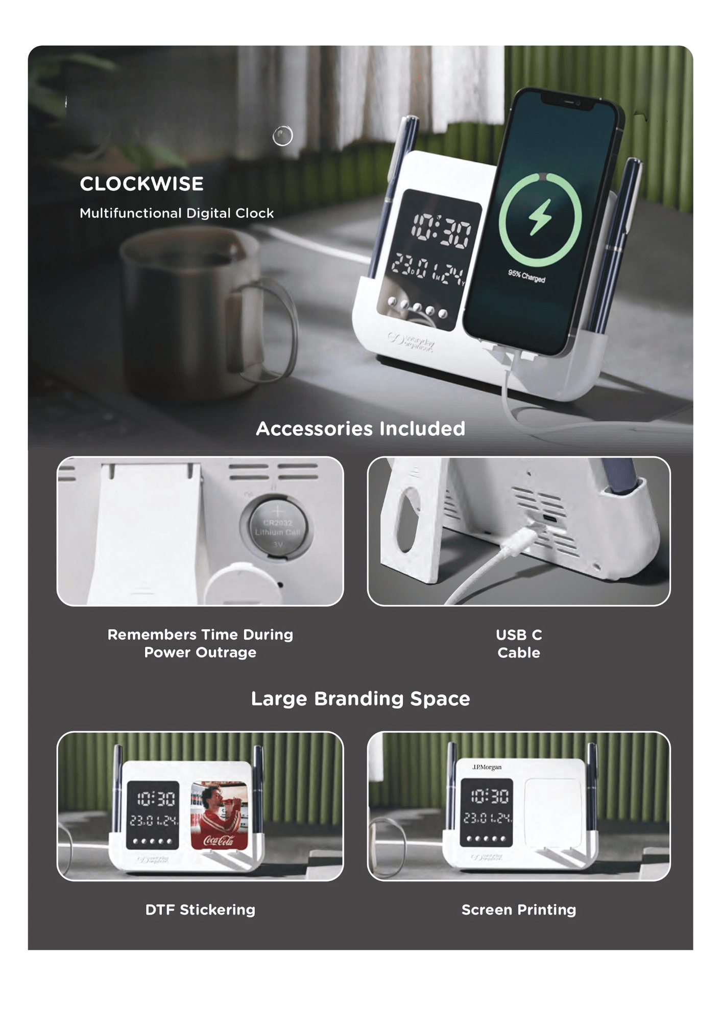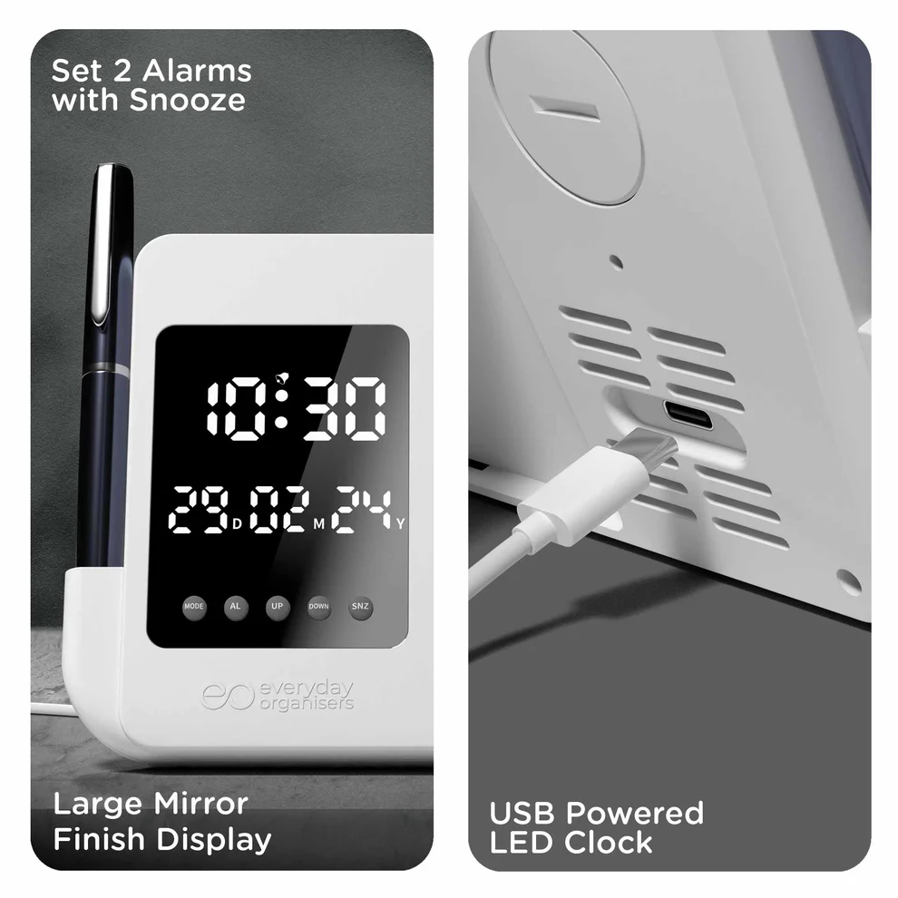 Featuring a stylish split-front design, it combines a large, mirror-finished 10cm display with a convenient phone holder and pen stand. Stay organized and informed with its clear clock face, USB-C charging, and memory function that retains your preferred time settings. DIY stickers available.
