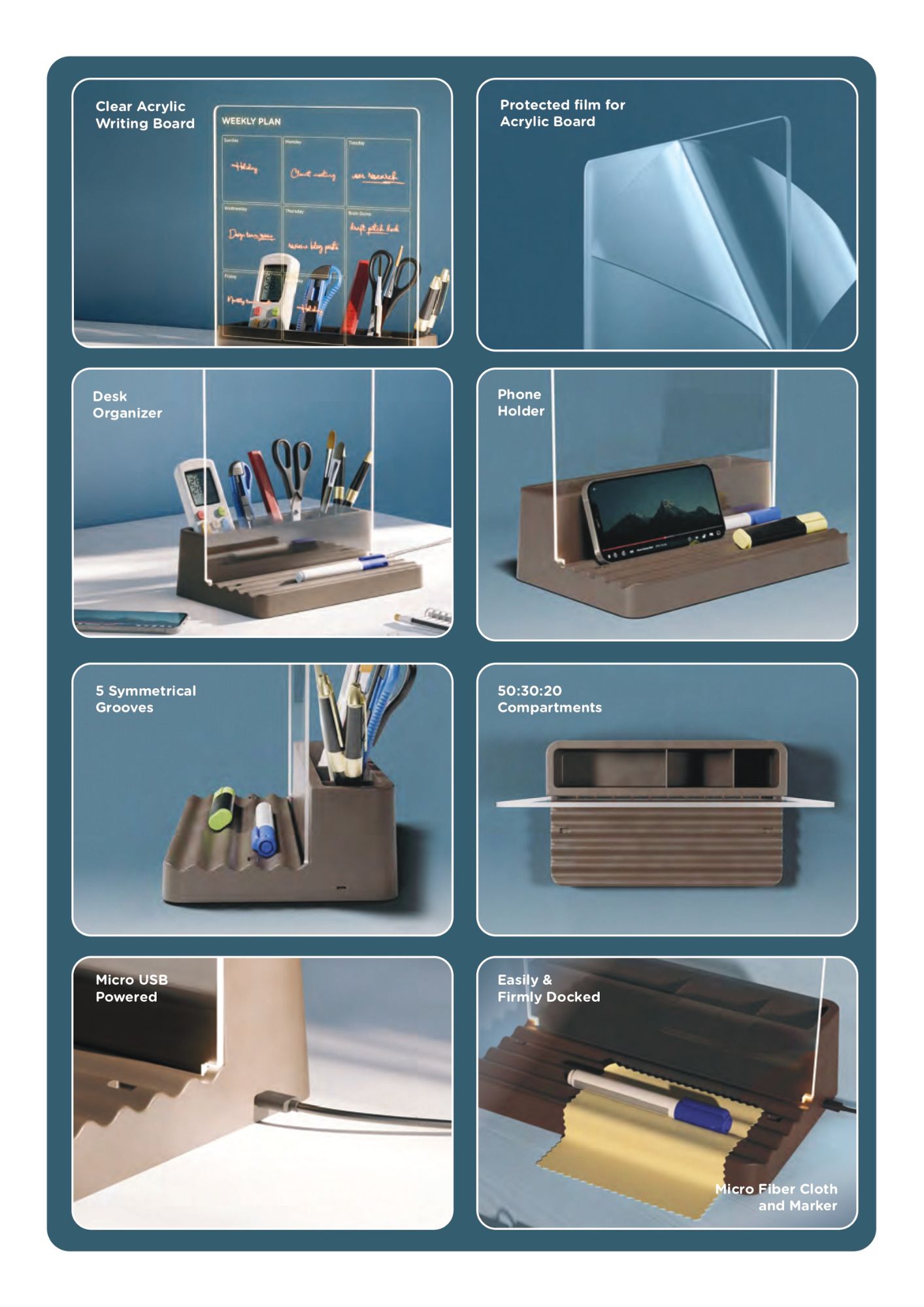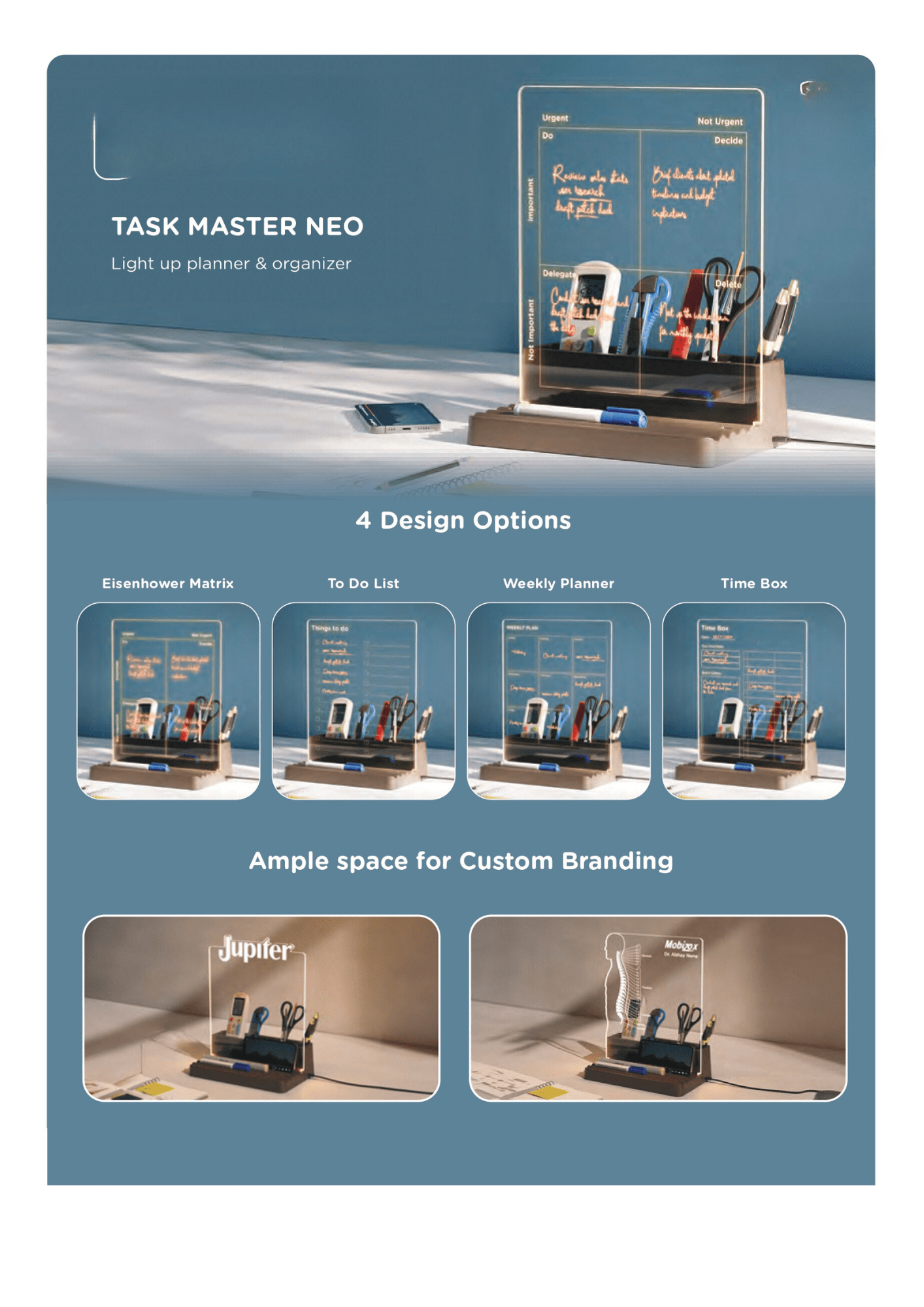 Experience the epitome of minimalist efficiency with Taskmaster Neo. This sleek LED desk organizer, featuring a reduced-height acrylic sheet, combines style and functionality seamlessly. Its monthly planner design empowers you to prioritize tasks and stay organized. Enjoy the convenience of a built-in pen stand, bright LED lighting, and versatile storage compartments. Whether you’re a working professional or a student, Taskmaster Neo is the ideal tool to elevate your workspace and enhance your productivity.